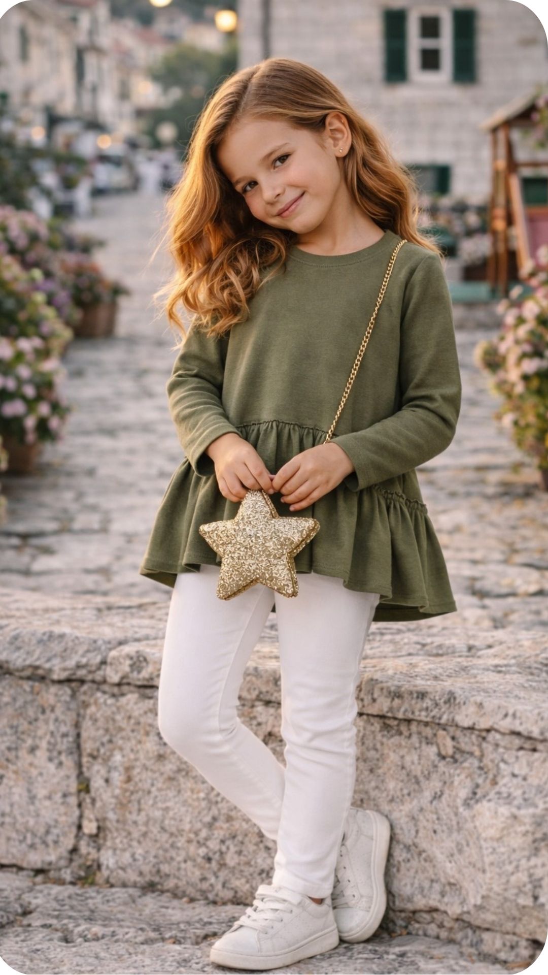 Model je dugih rukava s klasičnim okruglim izrezom i ženstvenim peplum volanom koji daje poseban, moderan izgled. Ovaj limitirani set idealan je za svakodnevno nošenje, vrtić, školu ili posebne prilike.