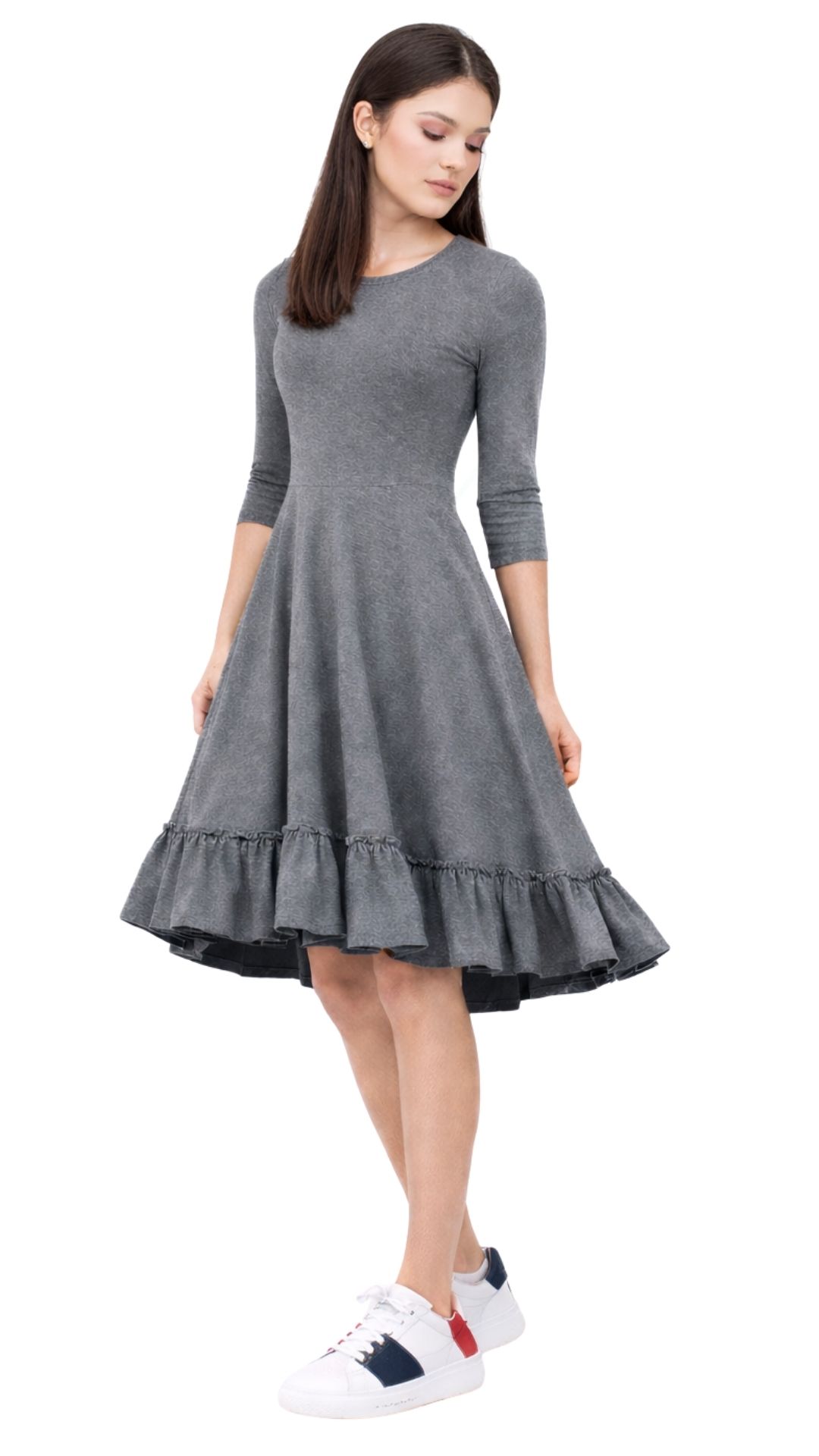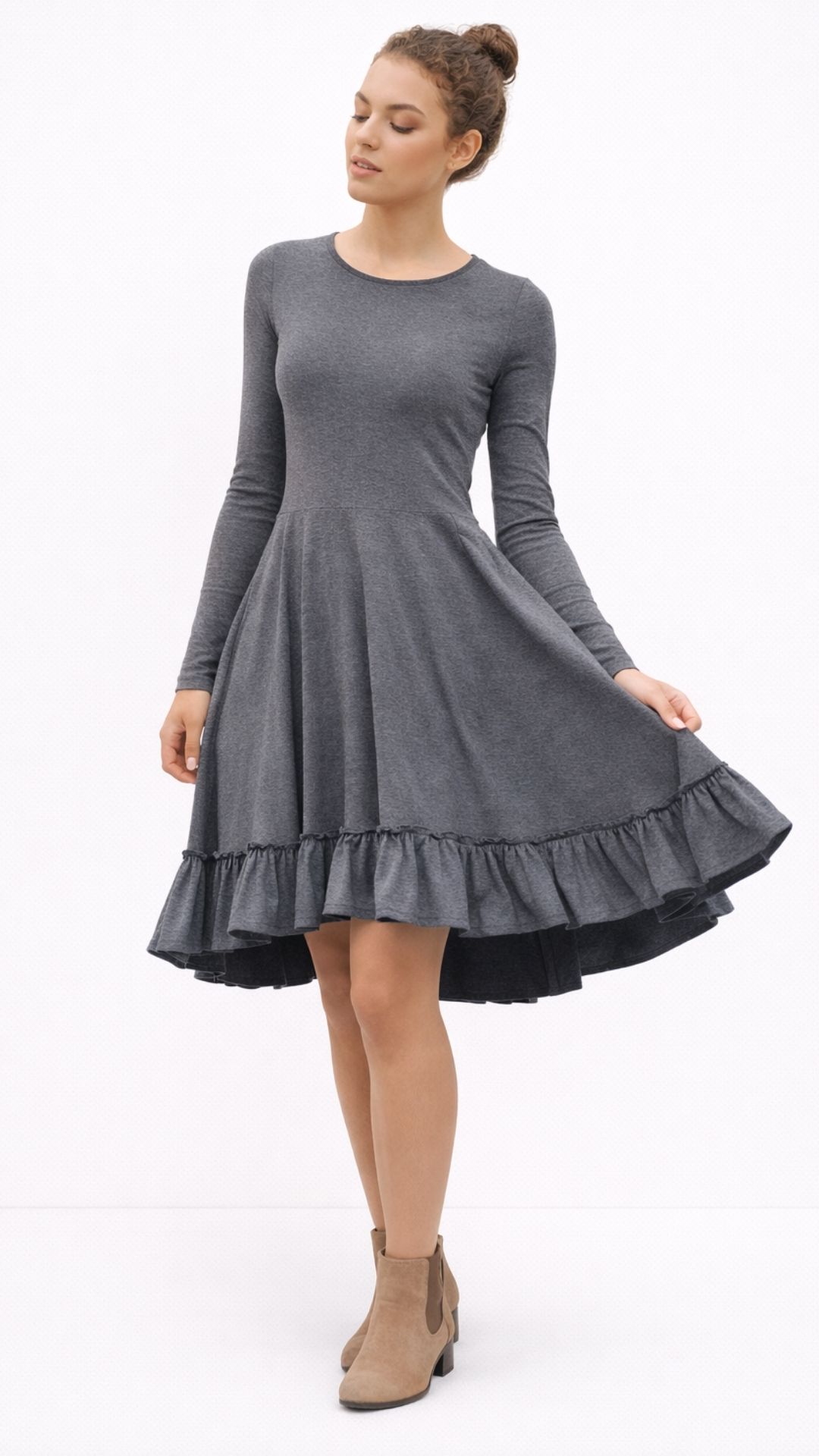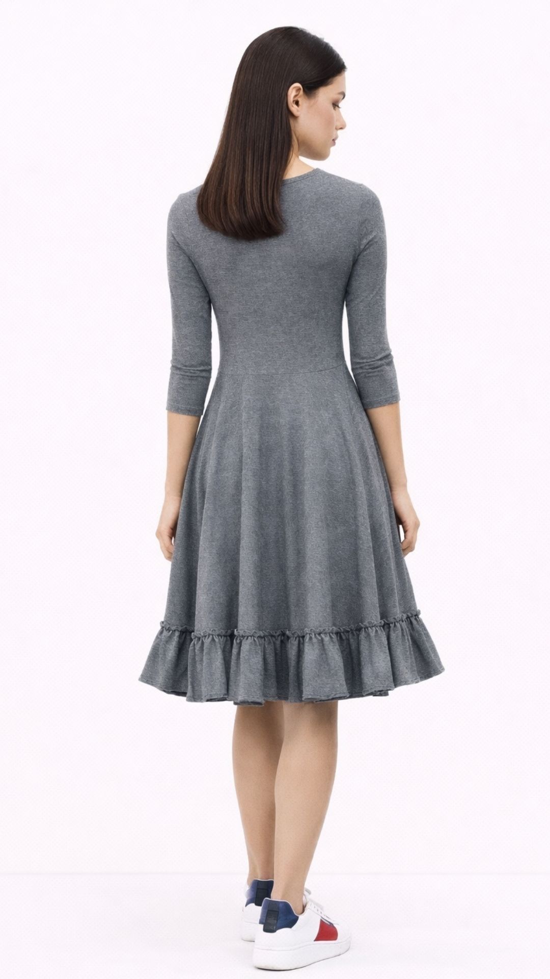 Haljina DONNEL Stella dizajnirana je za žene koje žele udobnost, ženstvenost i bezvremenski stil u jednom komadu. Kroj punog kruga lijepo naglašava struk, dok se donji dio haljine lepršavo širi i prati svaki pokret. Volan na rubu daje haljini dodatnu dinamiku i romantičan izgled.