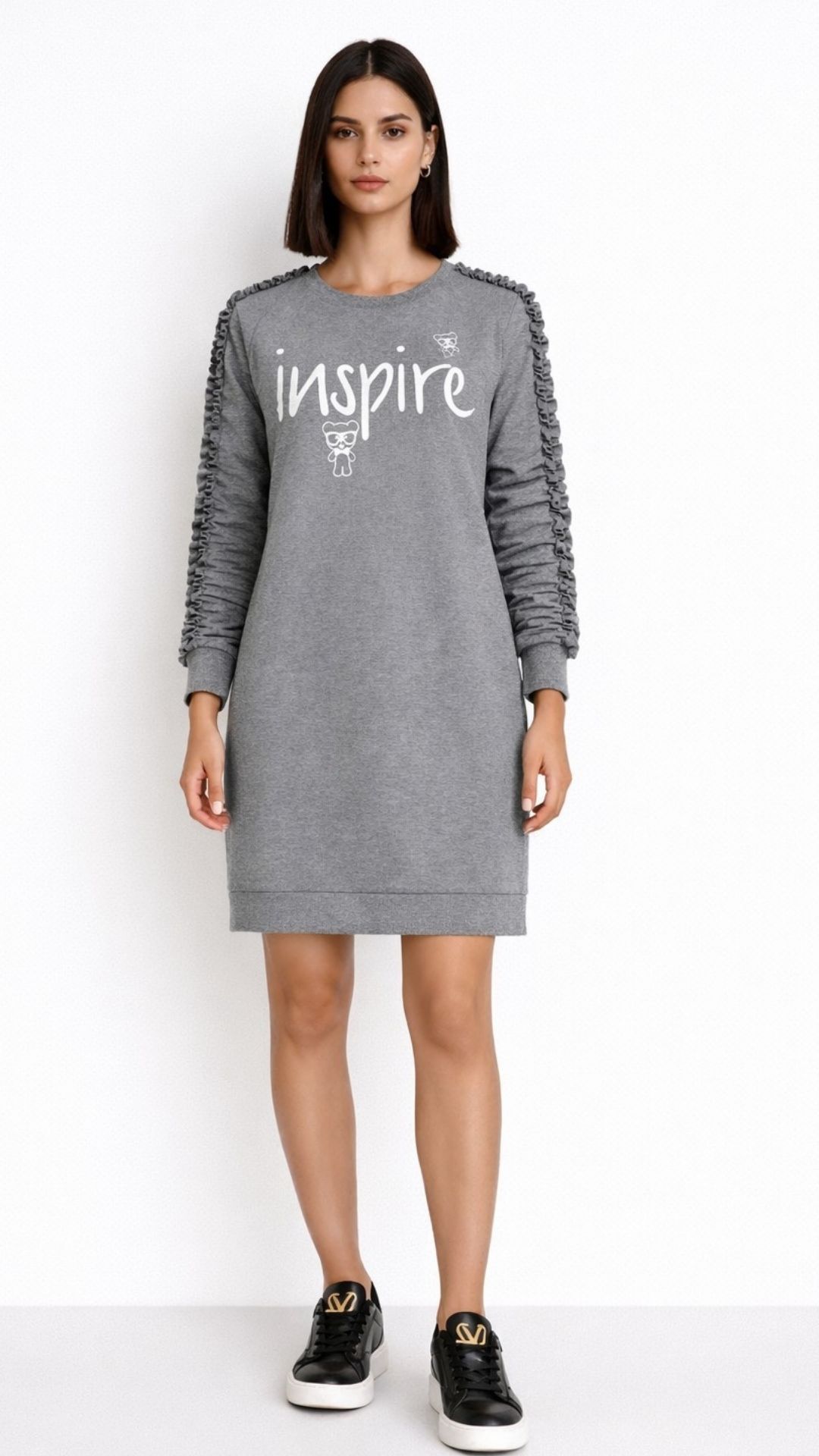 Moderan kroj i diskretni detalji na rukavima daju haljinama urbani izgled, dok neutralna siva boja omogućuje lako kombiniranje u svim prilikama – od svakodnevnih šetnji do posebnih obiteljskih trenutaka.