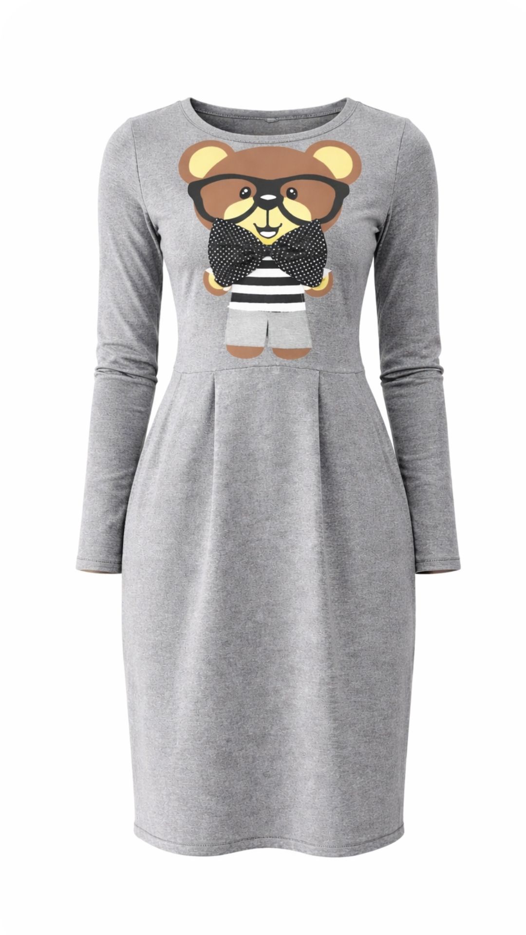 Poseban naglasak daje trendi teddy bear print, koji haljini daje razigran, moderan i prepoznatljiv izgled. Dužina do koljena i dugi rukavi čine je idealnom za svakodnevno nošenje, posao, šetnje ili opuštene gradske kombinacije.
