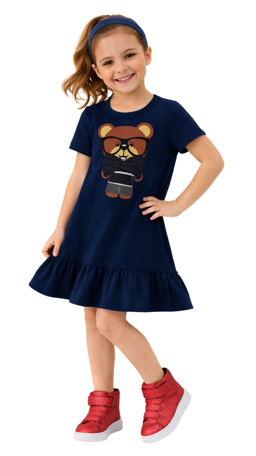 DONNEL Tessa je razigrana dječja haljinica koja unosi boju i veselje u svaki outfit. Jarka narančasta boja ističe se u garderobi, dok preslatki print smeđeg medvjedića s naočalama i crnom mašnom daje poseban šarm. Volan na donjem rubu čini je lepršavom i udobnom za nošenje.